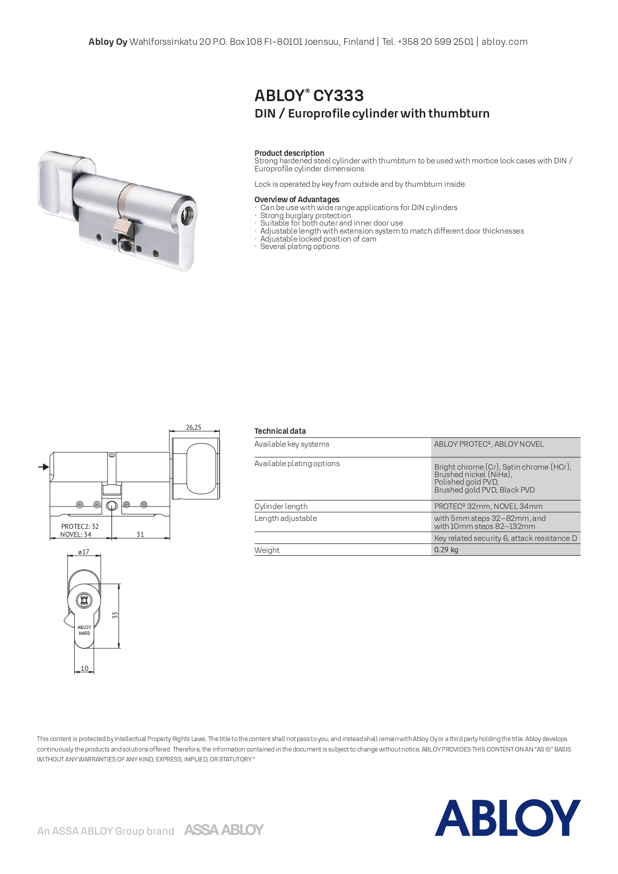 ABLOY CY333T PROTEC 2 High Security Cylinder Lock